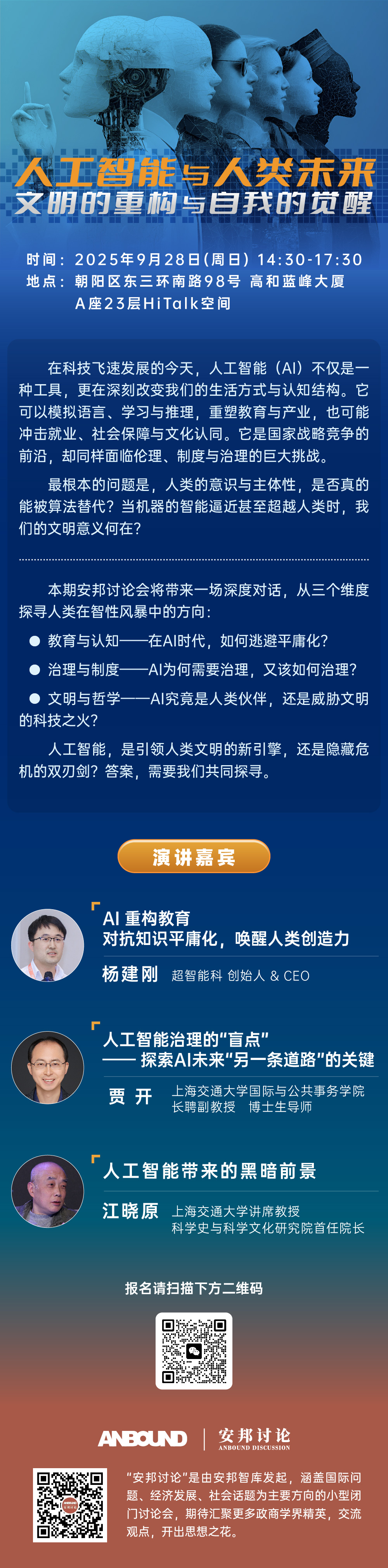 本期安邦讨论会将带来一场深度对话,从三个维度探寻人类在智性风暴中的方向: