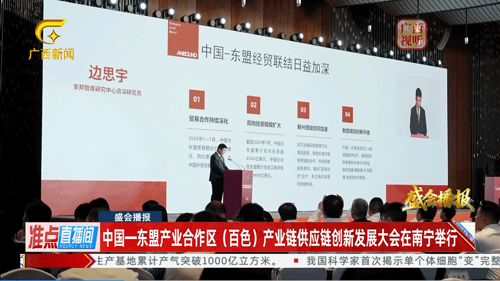 会上,安邦智库宏观经济研究中心边思宇博士深入剖析了当前国际形势下所面临的挑战与应对策略:他指出,中国与东盟的经贸联系持续深化,中国已连续16年成为东盟最大贸易伙伴,2025年1-7月双边贸易额达5970亿美元,投资与新兴产业合作稳步推进。