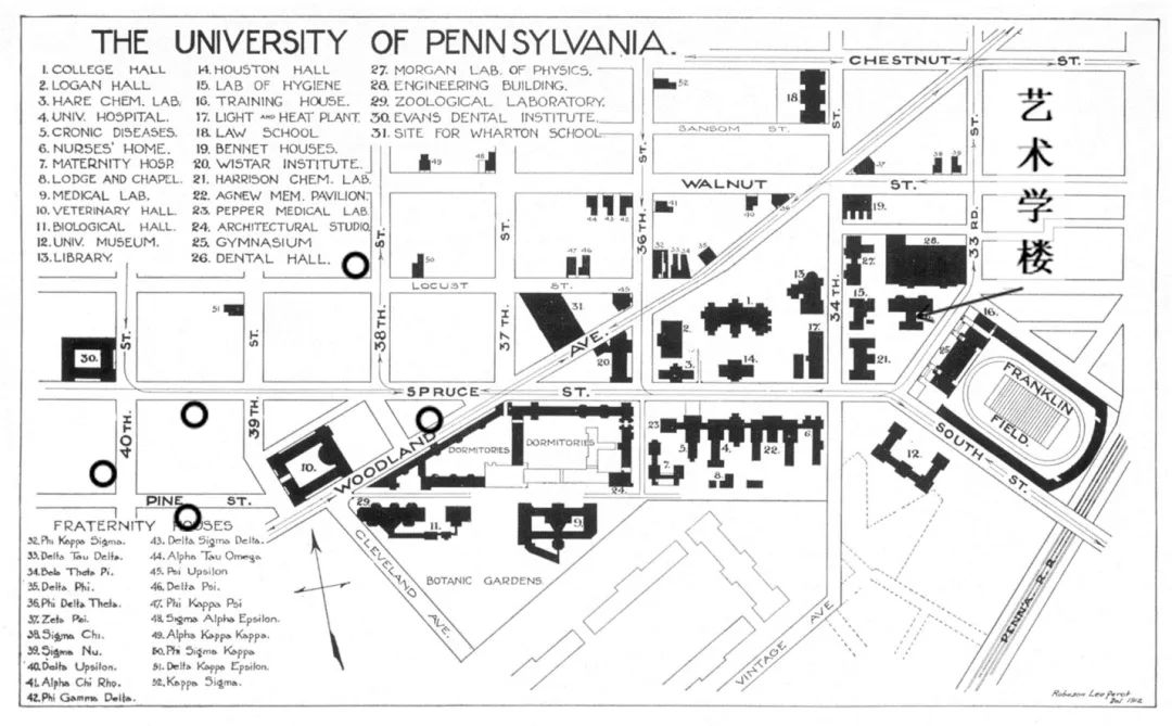 宾大富兰克林运动场西北的26号楼“牙医学楼”在1920年改为艺术学楼。校园主要位于林地大道以南。圆圈代表梁和林在1924—1927年期间居住的地方。