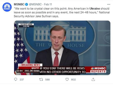 这一天,拜登总统的国家安全顾问沙利文发出令人震惊的信息:俄罗斯将在24-48小时之内,发动对乌克兰的入侵,美国公民要立即撤离乌克兰。他并且严厉的警告,任何在乌克兰的美国人,都应该尽快离开,战争爆发之后,美国政府不会负责撤离美国公民。同时他还表示,美国已经命令美国驻乌克兰首都基辅的大使馆立即撤离。