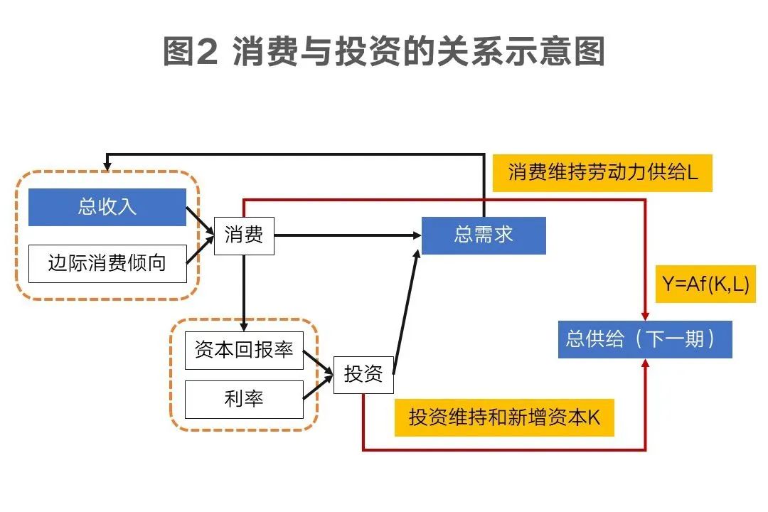 如果我们沿着一条时间轴,去理解二者的关系,可以发现:在仅关注单期的情况下,容易形成消费与投资竞争瓜分蛋糕的看法,从而将消费和投资割裂开来,认为两者是此消彼长的关系。如果进一步考虑多期,投资的地位会上升。这是因为当期投资能够抵补资本折旧并增加下一期投入生产的资产,进一步产生下一期收入和消费,投资作为各期生产活动“连接器”的作用将会放大。而如果从长期考虑,那么消费的地位又会上升。人类经济活动的最终目的是消费,关系到国民福祉,关系到人们对美好生活的追求,是一切生产活动的终极意义。一切供给最终都要依靠消费实现其价值。尤其值得指出的是,消费也是维系劳动力可持续供给的条件,是用于维系劳动者体能或智力的人力资本投资。这不同于狭义的资本品投资。