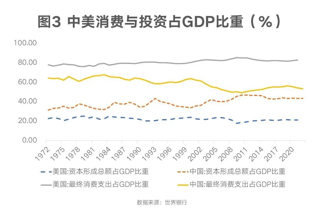 根据世界银行数据,美国的资本形成总额占GDP的比重相对稳定,在20%~26%之间波动。而中国的比重从20世纪70年代初的31%波动上升至2011年的46.7%,随后小幅下降稳定在43%左右(见图3)。美国的消费支出占比相对较高,且总体上保持相对稳定,表明美国的经济模式更加注重消费。在1972年至2021年,美国最终消费支出占GDP比重的变化范围在75.75%~85.13%。中国消费支出占比在2000年后有所下滑,从63.6%跌至2010年的48.9%,随后小幅上升。